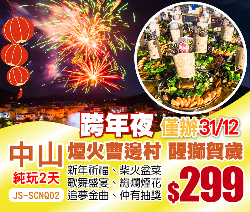 曹邊村跨年夜,僅辦31/12一期,賞絢爛煙花、睇歌舞盛宴、為新年祈福、品柴火盆菜!中山純玩2天,實價$299!