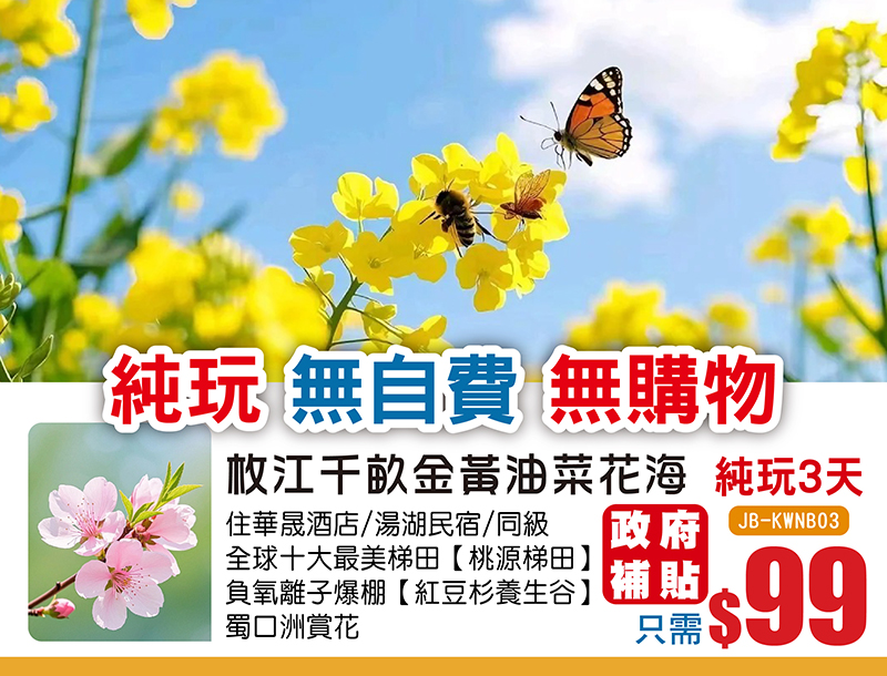 遂川賞桃花、櫻花、千畝油菜花海,純玩無自費無購物,政府補貼,3天只需$99!