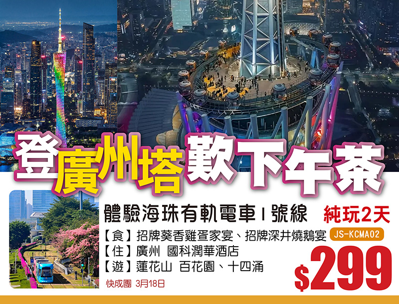 包門票登廣州塔歎下午茶 體驗有軌電車1號線 無購物無聽書 純玩2天$299!