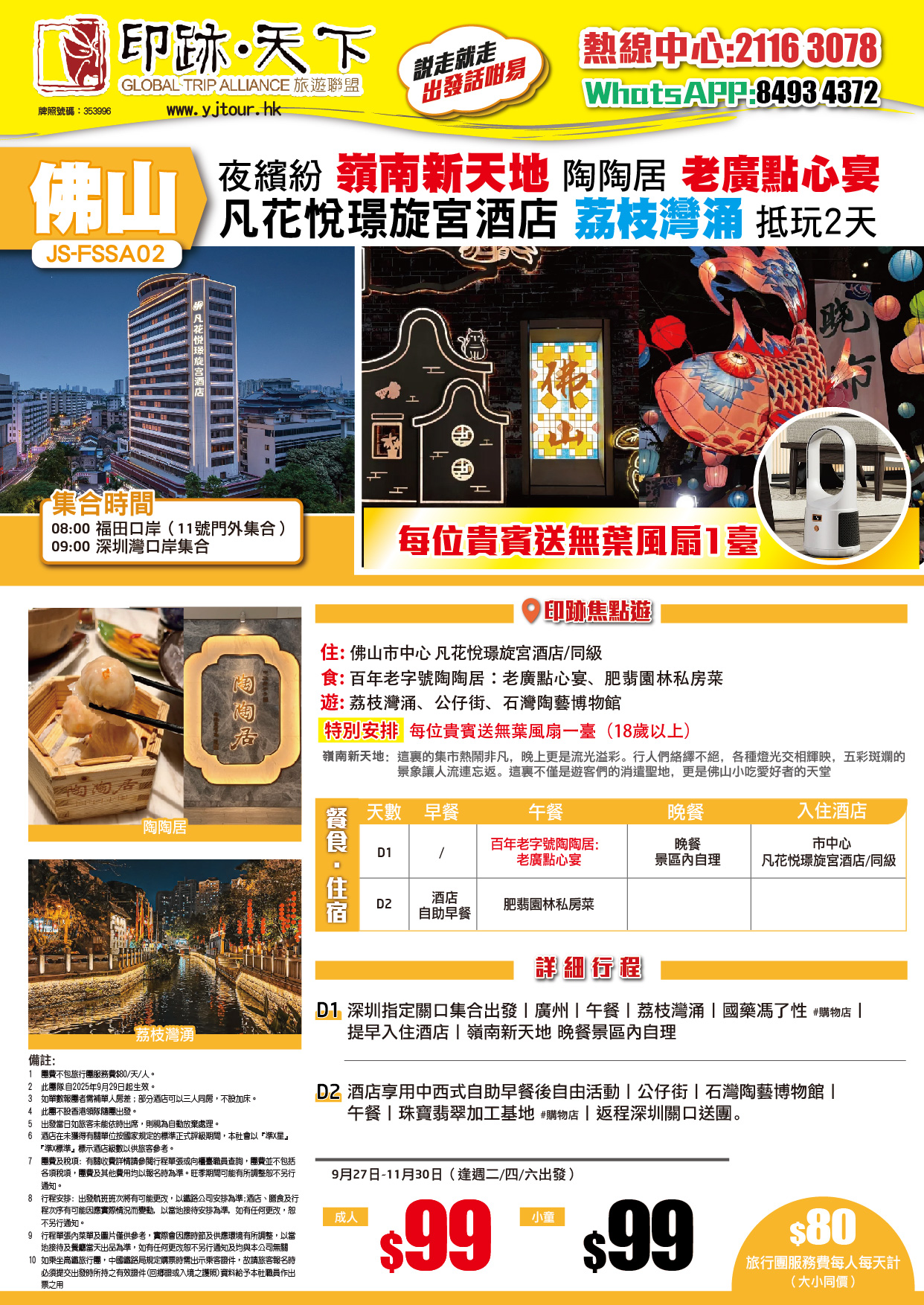 D1、深圳指定關口集合出發→前往佛山→午餐→【荔枝灣湧】→【國藥馮了性】(*購物店)→提早入住酒店→【嶺南新天地】(晚餐景區內自理)。