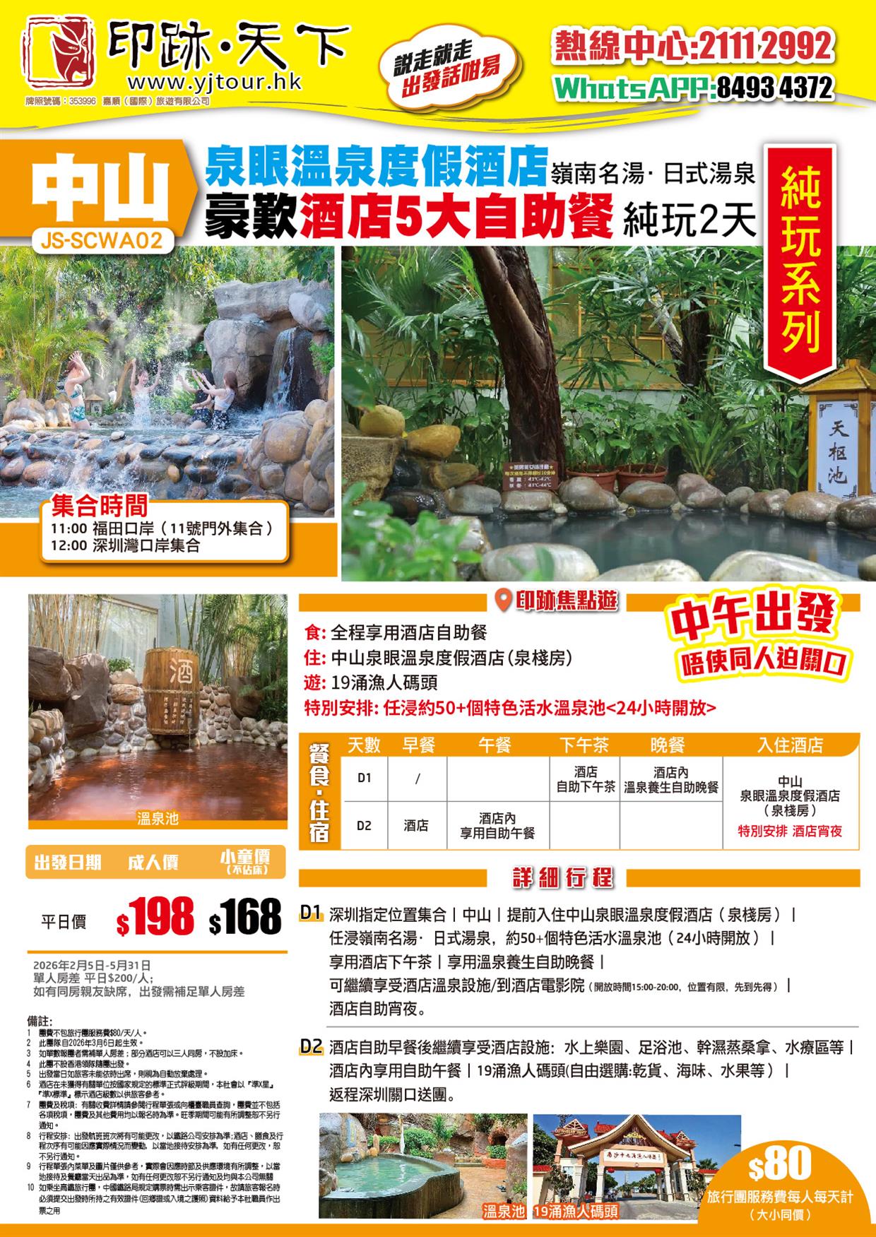 D1、深圳指定位置集合→前往→中山→提前入住中山泉眼溫泉度假酒店→任浸嶺南名湯·日式湯泉,約50+個特色活水溫泉池(24小時開放)→享用酒店下午茶→內享用溫泉養生自助晚餐→可繼續享受酒店溫泉設施或到酒店電影院(開放時間15:00-20:00,位置有限,先到先得)→酒店自助宵夜。