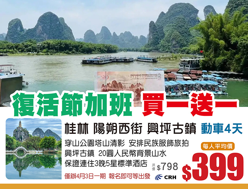桂林 陽朔西街 僅辦復活節4月3日出發 原價$798 買一送一 每人平均價只需$398