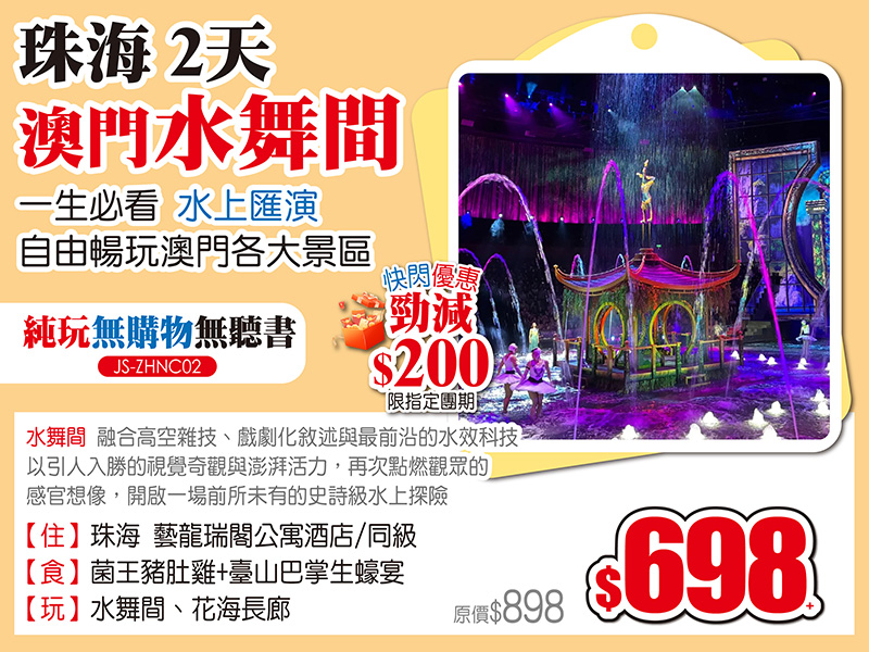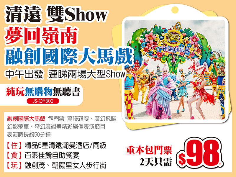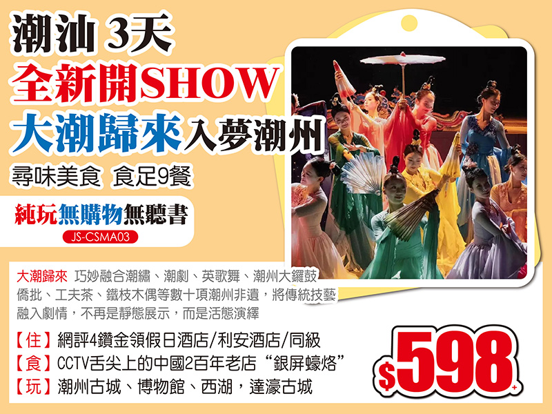 睇3大經典SHOW-澳門水舞間-清遠夢回嶺南+融創大馬戲-潮州大潮歸來,純玩2/3天,低至$98起!水舞間仲有勁減$200限時優惠!